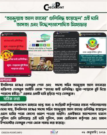 সামাজিক যোগাযোগ মাধ্যমে প্রাপ্ত তথ্য ও সংশ্লিষ্ট কর্তৃপক্ষের বক্তব্য পর্যালোচনায় দেখা যায়, ইনকিলাব মঞ্চের সদস্য সচিব আব্দুল্লাহ আল জাবের গুলিবিদ্ধ হয়েছেন এমন দাবির পক্ষে কোনো প্রমাণ পাওয়া যায়নি। একইভাবে আন্দোলন দমনে পুলিশ গুলি চালিয়েছে এই দাবি পুলিশ, ঢাকা মেডিকেল কর্তৃপক্ষ এবং প্রধান উপদেস্টার ফেসবুক পেজ থেকে নাকচ করা হয়েছে।