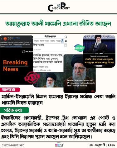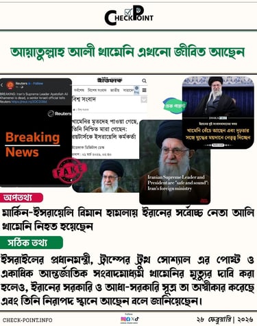 ইসরাইলের প্রধানমন্ত্রী, ট্রাম্পের ট্রুথ সোশ্যাল এর পোষ্ট ও একাধিক আন্তর্জাতিক সংবাদমাধ্যম খামেনির মৃত্যুর দাবি করা হলেও, ইরানের সরকারি ও আধা-সরকারি সূত্র তা অস্বীকার করেছে এবং তিনি নিরাপদ স্থানে আছেন বলে জানিয়েছেন। সুতরাং, ইরানের সর্বোচ্চ ধর্মীয় নেতা আয়াতুল্লাহ আলি খামেনির মৃত্যুর দাবিটি বিভ্রান্তিকর।