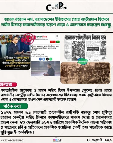 সম্প্রতি একাধিক সংবাদমাধ্যম ও সামাজিক মাধ্যমে একটি দাবি ছড়িয়ে পরেছে যে, আন্তর্জাতিক মাতৃভাষা ও মহান শহীদ দিবস উপলক্ষ্যে একুশের প্রথম প্রহরে রাজধানীর কেন্দ্রীয় শহীদ মিনারে বাংলাদেশের ইতিহাসের প্রথম রাষ্ট্রপ্রধান হিসেবে দোয়া ও মোনাজাতে অংশ নেন প্রধানমন্ত্রী তারেক রহমান।
