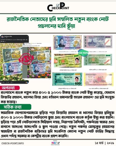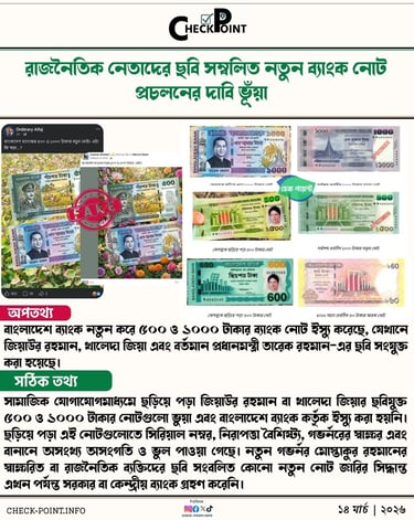 সামাজিক যোগাযোগমাধ্যমে ছড়িয়ে পড়া জিয়াউর রহমান বা খালেদা জিয়ার ছবিযুক্ত ৫০০ ও ১০০০ টাকার নোটগুলো ভুয়া এবং বাংলাদেশ ব্যাংক কর্তৃক ইস্যু করা হয়নি। ছড়িয়ে পড়া এই নোটগুলোতে সিরিয়াল নম্বর, নিরাপত্তা বৈশিষ্ট্য, গভর্নরের স্বাক্ষর এবং বানানে অসংখ্য অসংগতি ও ভুল পাওয়া গেছে। নতুন গভর্নর মোস্তাকুর রহমানের স্বাক্ষরিত বা রাজনৈতিক ব্যক্তিদের ছবি সংবলিত কোনো নতুন নোট জারির সিদ্ধান্ত এখন পর্যন্ত সরকার বা কেন্দ্রীয় ব্যাংক গ্রহণ করেনি।