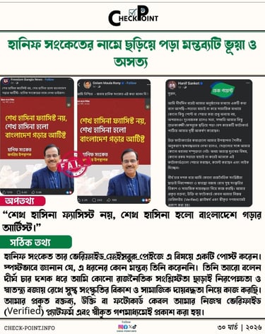 দীর্ঘ চার দশক ধরে আমি কোনো রাজনৈতিক সংশ্লিষ্টতা ছাড়াই নিরপেক্ষতা ও স্বাতন্ত্র্য বজায় রেখে সুস্থ সংস্কৃতির বিকাশ ও সামাজিক দায়বদ্ধতা নিয়ে কাজ করছি। আমার প্রকৃত বক্তব্য, উক্তি বা ফটোকার্ড কেবল আমার নিজস্ব ভেরিফাইড (Verified) প্ল্যাটফর্ম এবং স্বীকৃত গণমাধ্যমেই প্রকাশ করা হয়।” এছাড়া চেক পয়েন্ট মূলধারার কোন সংবাদ মাধ্যমে এধরণের সংবাদ খুঁজে পায়নি।