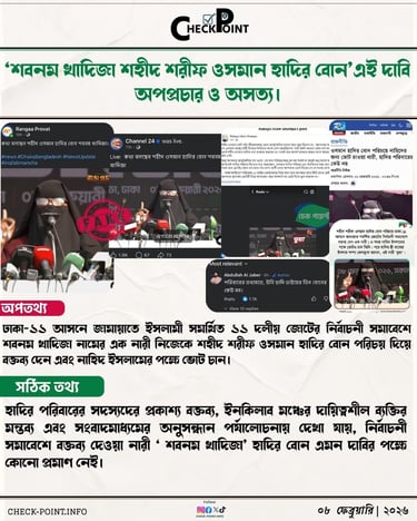 সামাজিক যোগাযোগ মাধ্যম ও বিভিন্ন ভিডিও বক্তব্যে দাবি করা হচ্ছে, আজ ৮ ফেব্রুয়ারি ঢাকায় অনুষ্ঠিত জামায়াতে ইসলামী সমর্থিত ১১ দলীয় জোটের নির্বাচনী সমাবেশে বক্তব্য দেওয়া নারী শবনম খাদিজা শরীফ ওসমান হাদির বোন। তবে চেকপয়েন্টের অনুসন্ধানে উঠে এসেছে, এই দাবি সত্য নয় এবং বিভ্রান্তিকর।