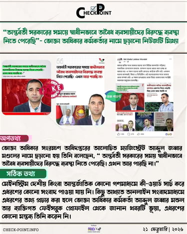 গত বুধবার রাজধানী ঢাকায় রমজানের বাজার মনিটরিংয়ে গিয়ে মবের শিকার হয়েছেন ভোক্তা অধিকার সংরক্ষণ অধিদপ্তরের আলোচিত ম্যাজিস্ট্রেট আব্দুল জব্বার মণ্ডল। এ ঘটনার একটি ভিডিও ইতোমধ্যে ভাইরাল হয়েছে সামাজিক যোগাযোগমাধ্যমে। পরবর্তীতে কিছু অনলাইন নিউজ পোর্টাল ও ফেসবুক পেইজ থেকে একটি ফটোকার্ড ছড়ানো হয়। যেখানে আব্দুল জব্বার মন্ডলের নামে ছড়ানো হয় তিনি বলেছেন, “ অন্তর্বর্তী সরকারের সময় স্বাধীনভাবে অবৈধ ব্যবসায়ীদের বিরুদ্ধে ব্যবস্থা নিতে পেরেছি। এখন আর পারছি না।” তবে Check Point এর অনুসন্ধানে উঠে আসে এমন মন্তব্য করেন নি ভোক্তা অধিকার কর্মকর্তা, ফটোকার্ডটি বানোয়াট।